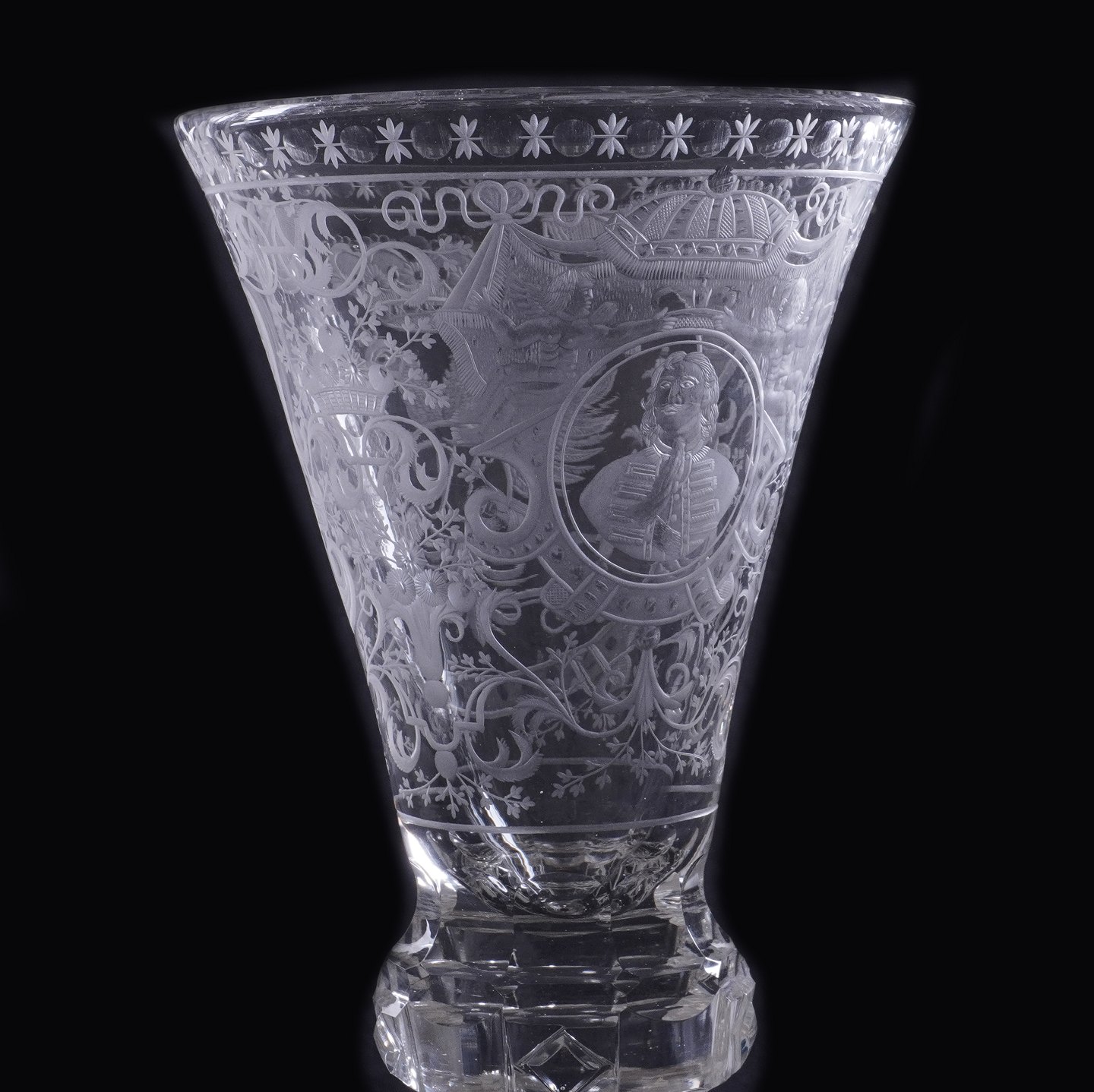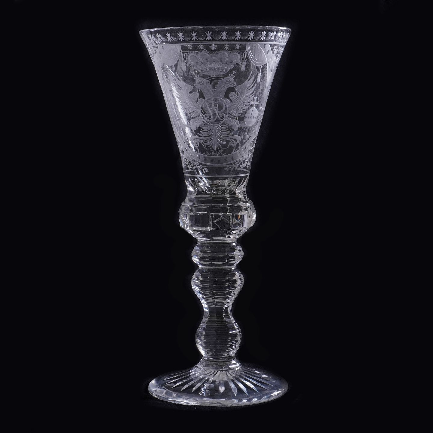 Tysk glas pragtpokal indgraveret med adeligt portræt og kronet spejlmonogram