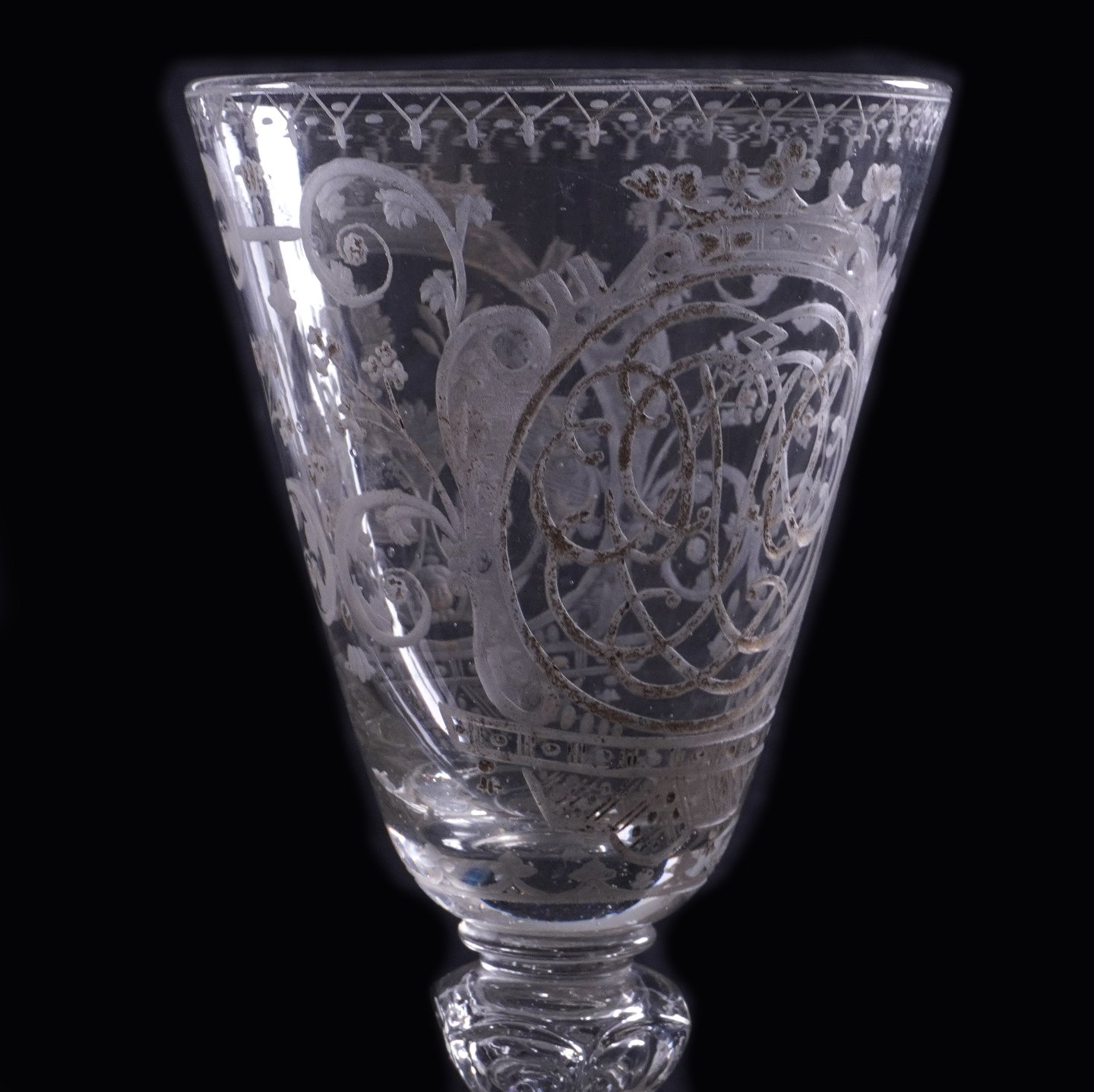Glaspokal Spiegelmonogramm und Allianzwappen