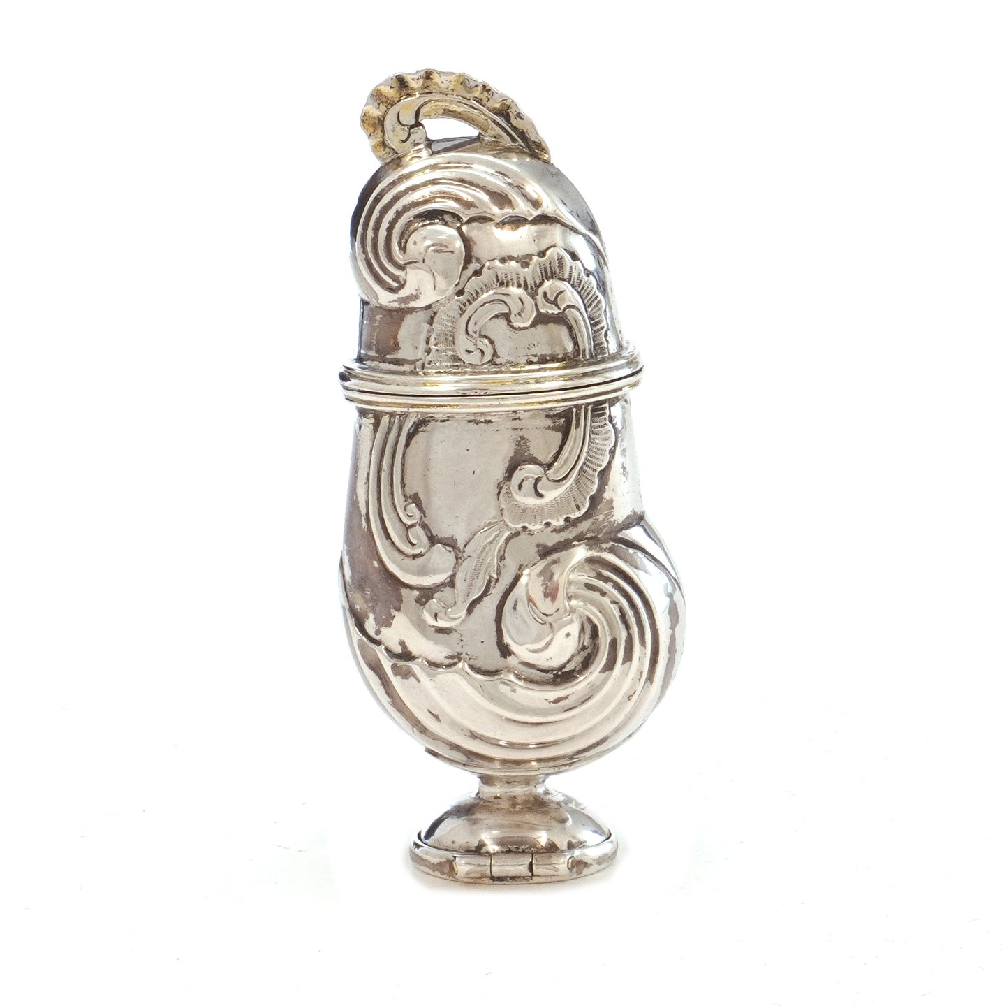 Hovedvandsæg i sølv såkaldt "Haneæg". Mester Joachim Weller, 1754-92, Holstebro. H: 8,2cm