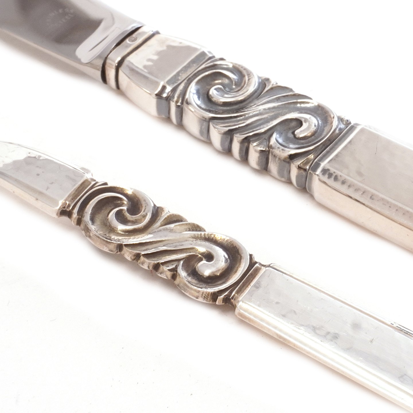 Johan Rohde for Georg Jensen Saga sterling sølv bestik bestående af seks frokostknive, seks spisegafler og seks dessertskeer. 18 dele i alt