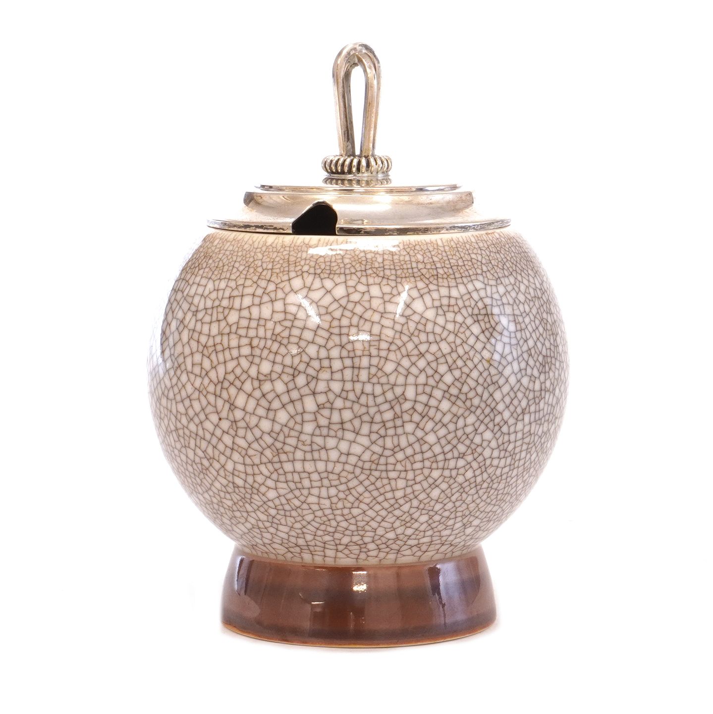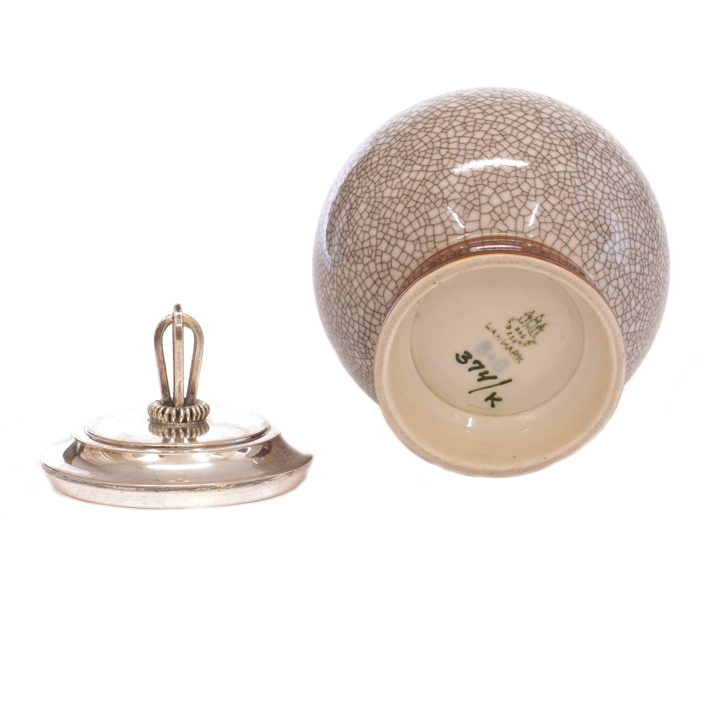 B&G marmeladekrukke i krakelé med sølvlåg af Hugo Grün, København, 1949