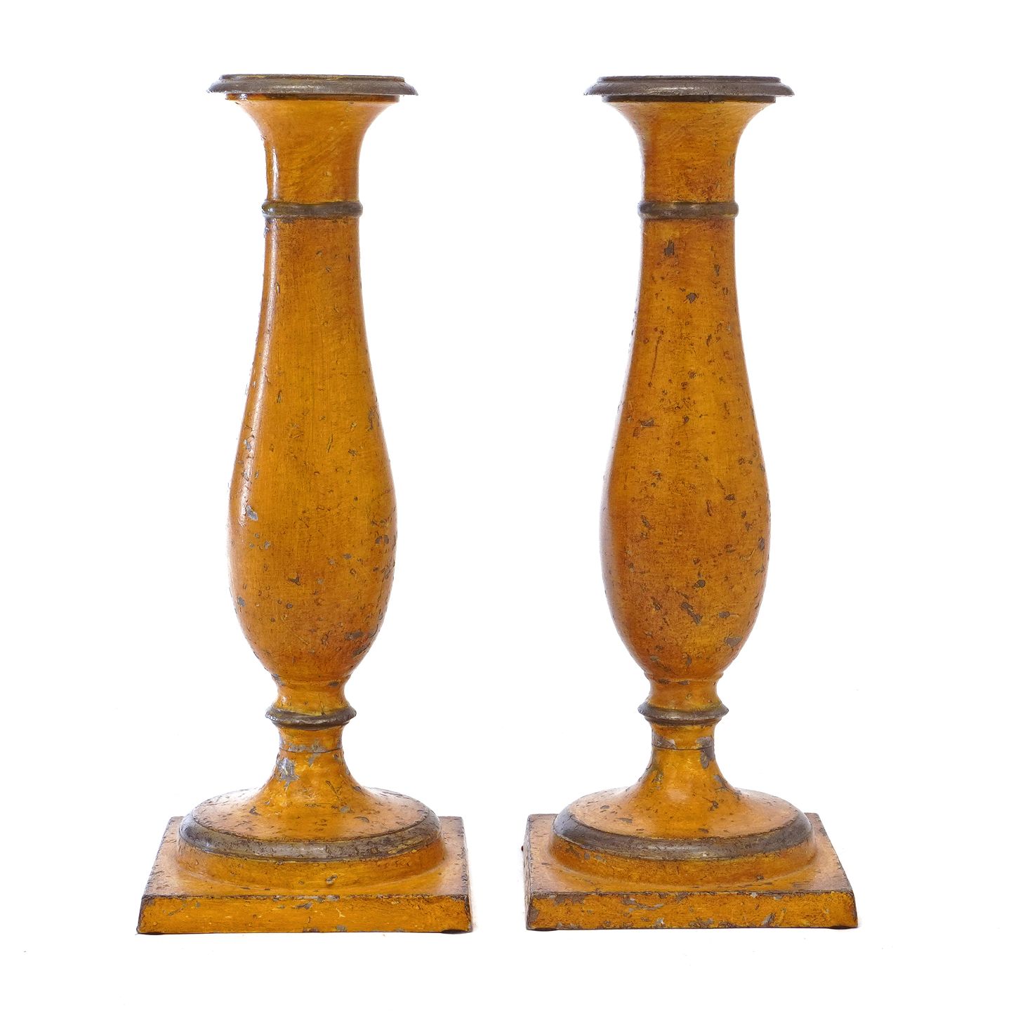 Et par mørkegule originaldekorerede tulipanstager udført i tin