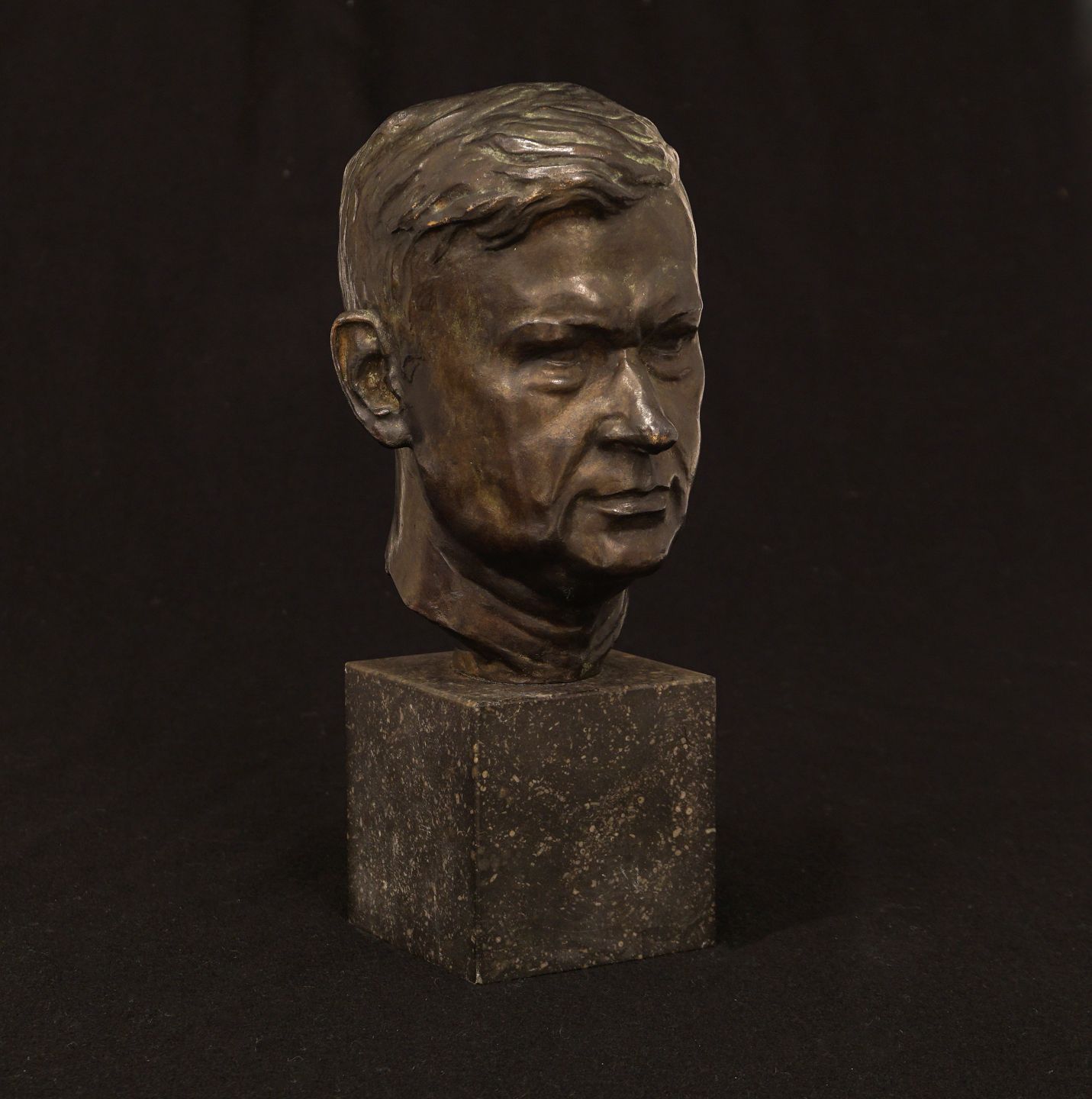 Bronzehoved på stensokkel. Støbt af L. Rasmussen, København, der bl.a. udførte opgaver for Kai Nielsen. H: 25,7cm