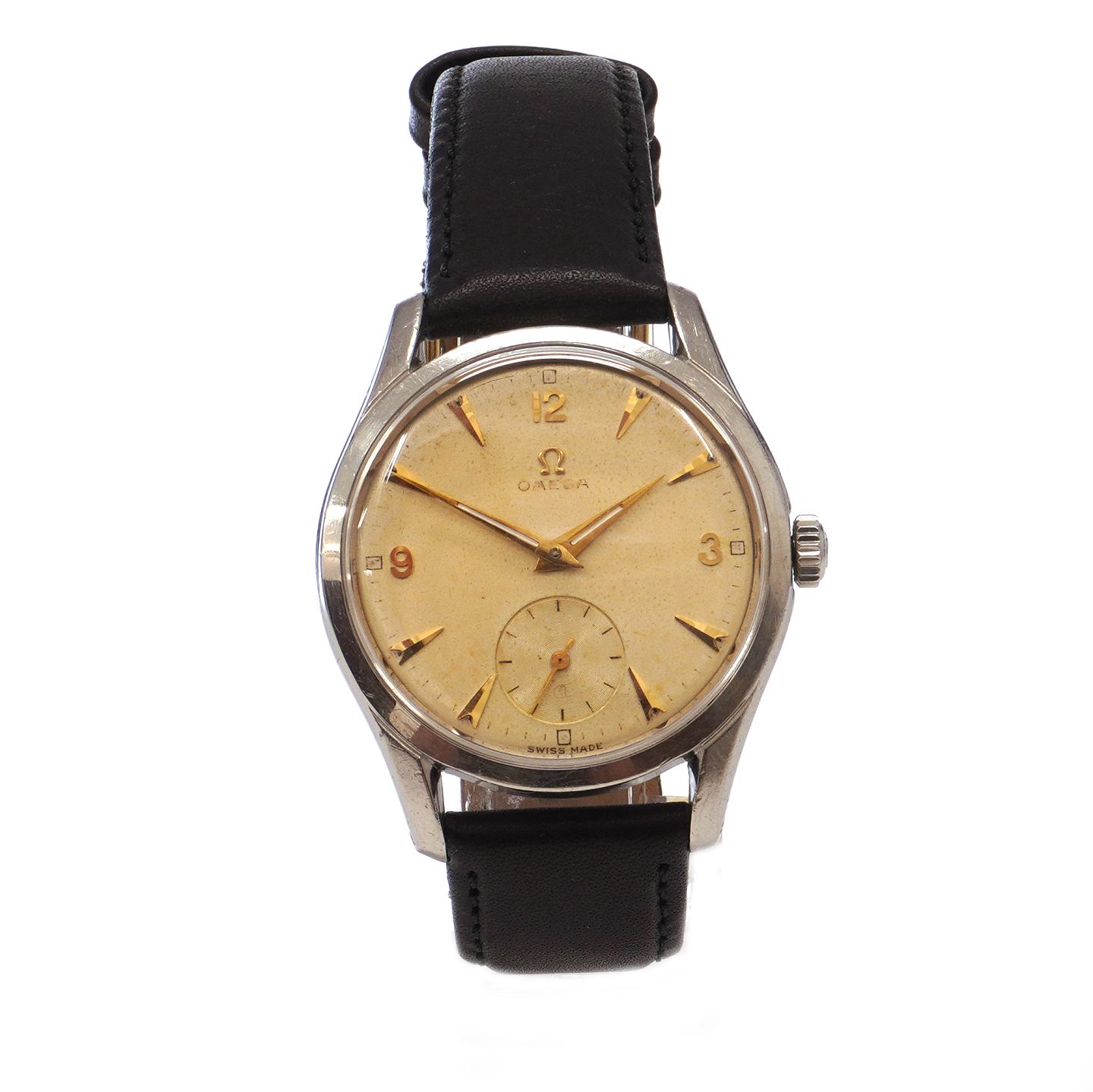 Omega armbåndsur i stål ref. 2639-8 ca. år 1951. Værk kaliber 265 med manuelt optræk. Skive i god stand med patina. D: 36mm