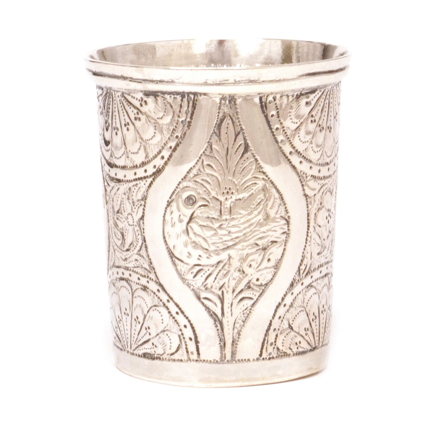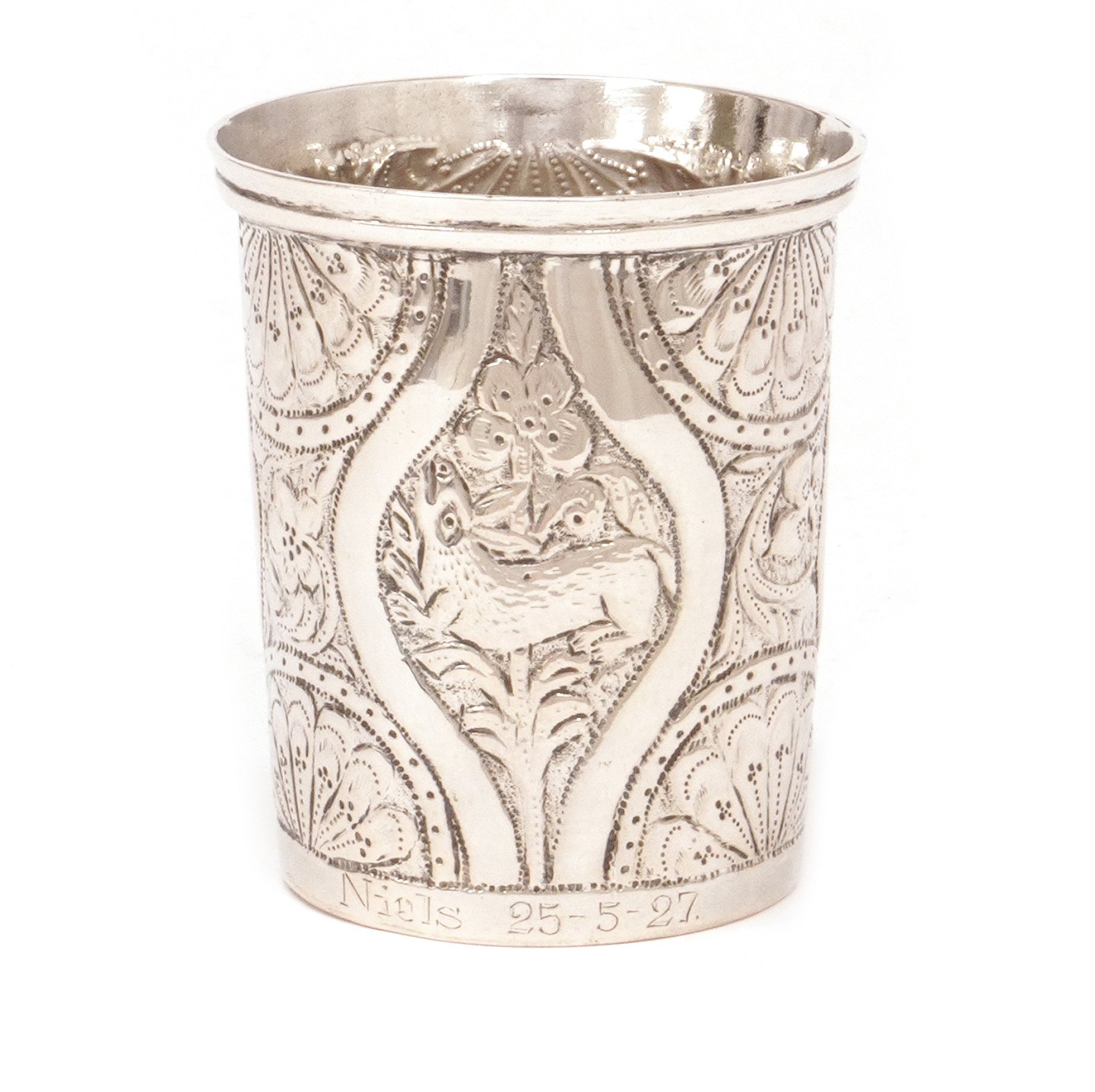 Russisk sølvbæger rigt dekoreret med fabeldyr. H: 7,4cm. V: 87,9gr