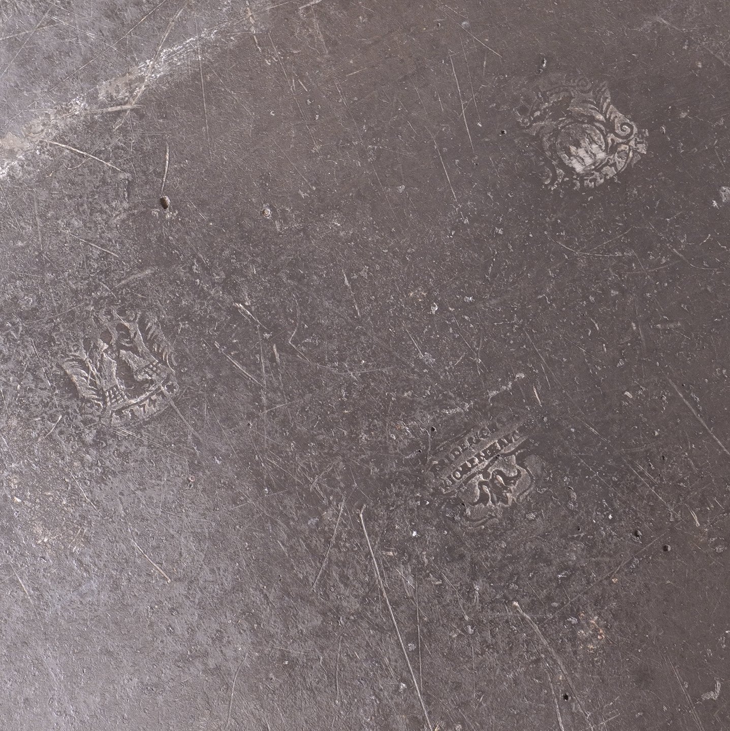 Tidligt og stort ovalt dyrerygsfad i tin udført af Friedrich Friedrich, København, 1747-1797, ca. år 1780. Mål: 77x43cm
