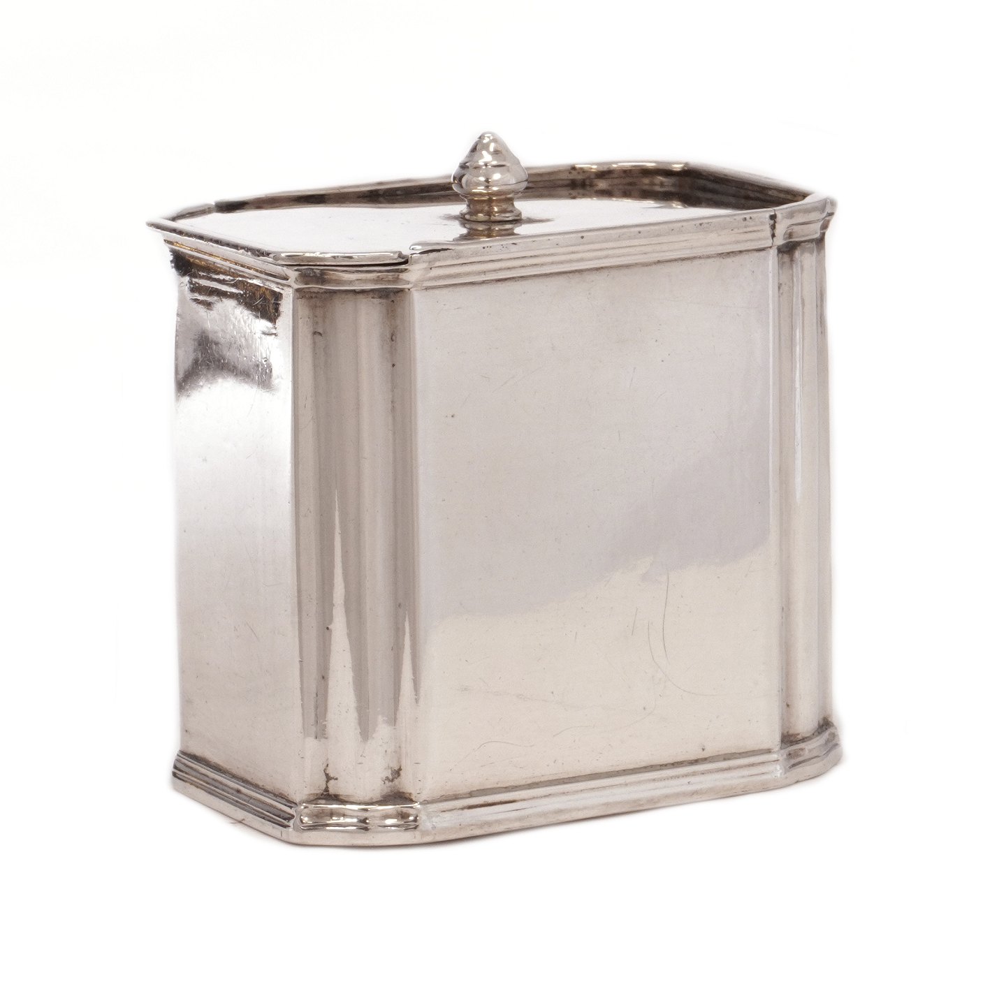 Sjælden Regence tedåse med skydelåg i sølv udført af Johan Mehl, Viborg, 1725-65