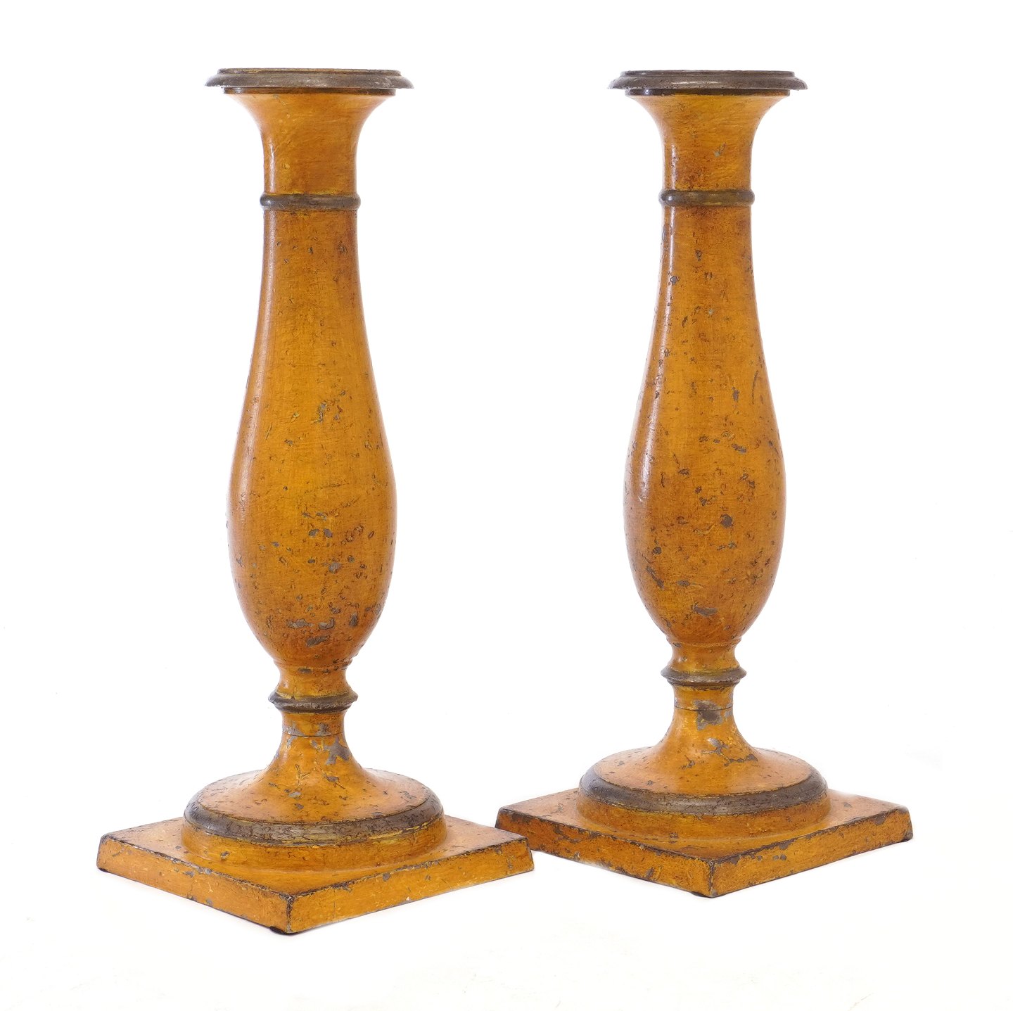 Et par mørkegule originaldekorerede tulipanstager udført i tin